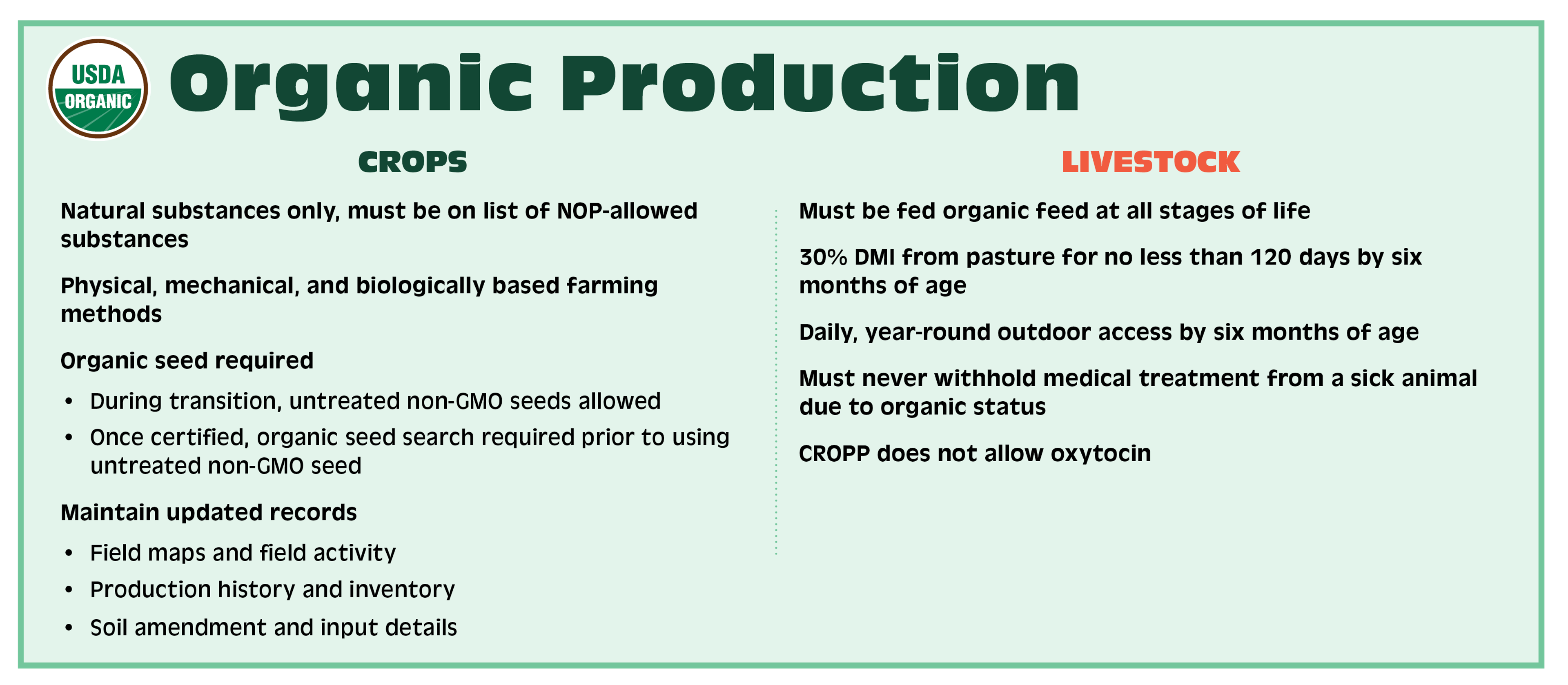 Every CROPP Cooperative/Organic Valley farm must be organically certified. Organic farmers are required to follow National Organic Program (NOP) rules for their crops, livestock, and livestock products to be sold or marketed as organic. Prior to selling your products, your operation must be issued an organic certificate through an accredited USDA certifying agent. If you are thinking about transitioning to organic production, here are a few things to consider.
